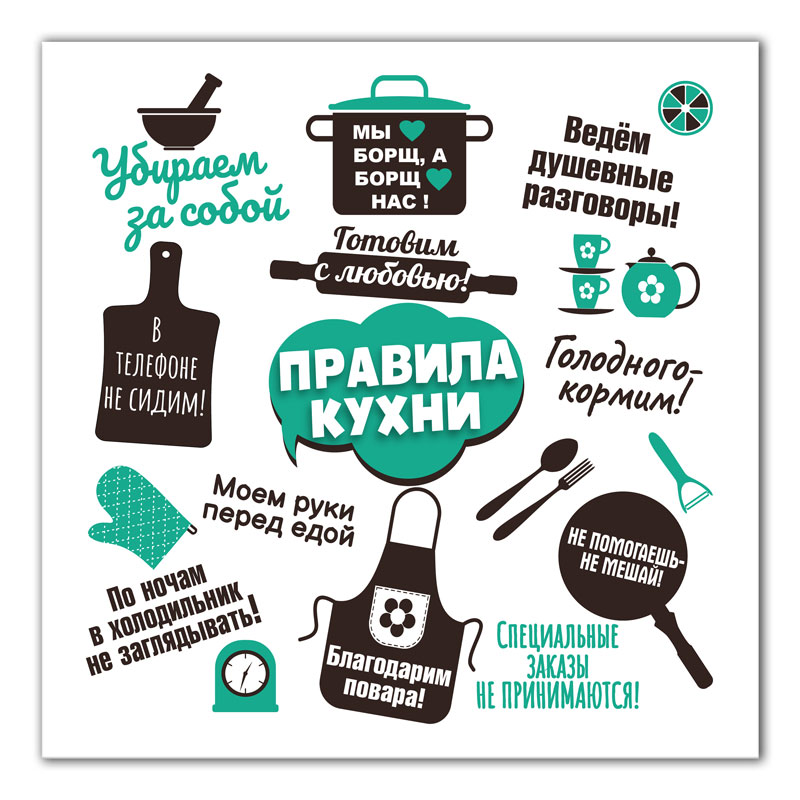 Картина на холсте Правила кухни (принт) напечатана на плотной дизайнерской бумаге с текстурой под холст. В качестве твердой основы под репродукцию используется ДВП (оргалит) плотный прессованный древесный материал. С обратной стороны сюжета предусмотрен подвес для крепления на стену. Рама узкая, всего 0,5 см, отлегает от стены на 1,5 см. Таким образом достигается эффект объемности работы. Сюжет упакован в защитную термоусадочную пленку,