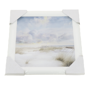 Непосредственно репродукция (принт) напечатана на плотной дизайнерской бумаге с текстурой под холст. В качестве твердой основы под репродукцию используется ДВП (оргалит) плотный прессованный древесный материал. С обратной стороны сюжета предусмотрен подвес для крепления на стену. Рама узкая, всего 0,5 см, отлегает от стены на 1,5 см. Таким образом достигается эффект объемности работы. Сюжет упакован в защитную термоусадочную пленку, которая не искажает его цвета при предварительном просмотре. Все четыре угла защищают картонные уголки из 3-слойного беленого картона. Размер сюжета без учёта ширины рамы - 30 х 30 см. Ширина рамы 0,5 см. Внешние габариты изделия (с учетом рамы) - 31 х 31 см.
