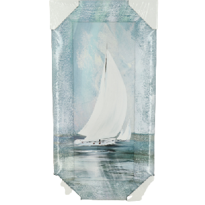 Непосредственно репродукция (принт) напечатана на плотной дизайнерской бумаге с текстурой под холст. В качестве твердой основы под репродукцию используется ДВП (оргалит) плотный прессованный древесный материал. С обратной стороны сюжета предусмотрен подвес для крепления на стену. Рама узкая, всего 0,5 см, отлегает от стены на 1,5 см. Таким образом достигается эффект объемности работы. Сюжет упакован в защитную термоусадочную пленку, которая не искажает его цвета при предварительном просмотре. Все четыре угла защищают картонные уголки из 3-слойного беленого картона. Размер 20х50 см.