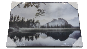 Непосредственно репродукция (принт) напечатана на плотной дизайнерской бумаге с текстурой под холст. В качестве твердой основы под репродукцию используется ДВП (оргалит) плотный прессованный древесный материал. С обратной стороны сюжета предусмотрен подвес для крепления на стену. Рама узкая, всего 0,5 см, отлегает от стены на 1,5 см. Таким образом достигается эффект объемности работы. Сюжет упакован в защитную термоусадочную пленку, которая не искажает его цвета при предварительном просмотре. Все четыре угла защищают картонные уголки из 3-слойного беленого картона.