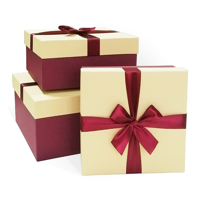 Коробка подарочная 21x21x11см РОГОЖКА с бантом слоновая кость-бордовый