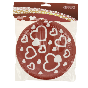 Тарелка красная с сердцами, изготовленная из бумаги с ламинацией, используется совместно с другими элементами коллекции по дизайну (тарелки, стаканы, приборы и т.п.) как украшение стола или по своему непосредственному назначению.