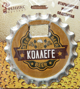 Ключ для открывания бутылок – это полезный и нужный прибор в каждом доме. Он представляет собой подставку под пивной стакан с отверстием для удобного снятия металлических пробок с бутылок. Лицевая сторона украшена оригинальным изображением, а на оборотной стороне закреплены магнит и три пробковые вставки для защиты поверхности стола от повреждений. Изделие выполнено из оцинкованного металла.