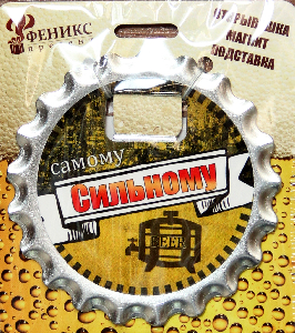Ключ для открывания бутылок – это полезный и нужный прибор в каждом доме. Он представляет собой подставку под пивной стакан с отверстием для удобного снятия металлических пробок с бутылок. Лицевая сторона украшена оригинальным изображением, а на оборотной стороне закреплены магнит и три пробковые вставки для защиты поверхности стола от повреждений. Изделие выполнено из оцинкованного металла.