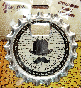 Ключ для открывания бутылок – это полезный и нужный прибор в каждом доме. Он представляет собой подставку под пивной стакан с отверстием для удобного снятия металлических пробок с бутылок. Лицевая сторона украшена оригинальным изображением, а на оборотной стороне закреплены магнит и три пробковые вставки для защиты поверхности стола от повреждений. Изделие выполнено из оцинкованного металла.