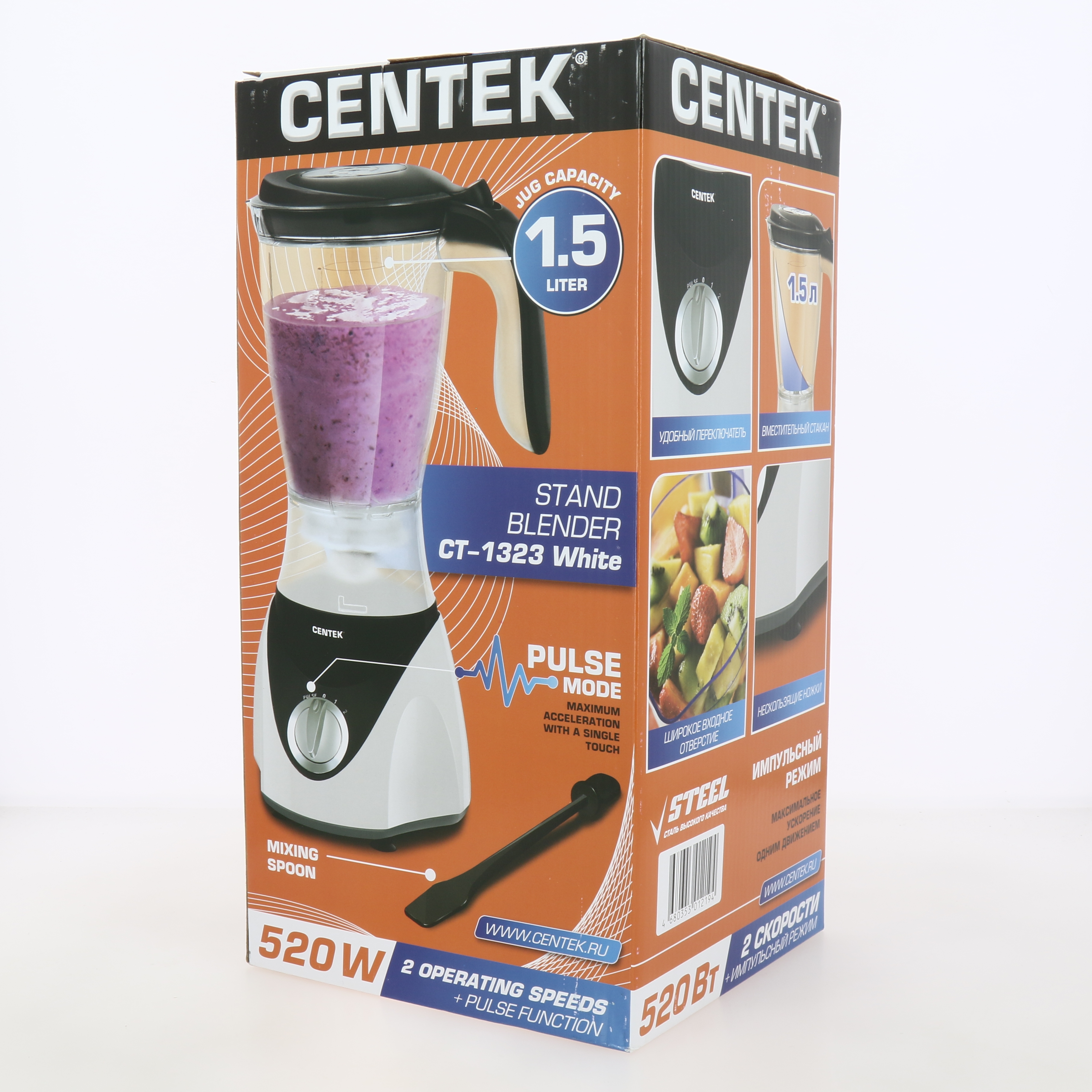 Блендер настольный 1,5л CENTEK CT-1323 White мощность 520Вт 2 скорости + импульс белый пластик