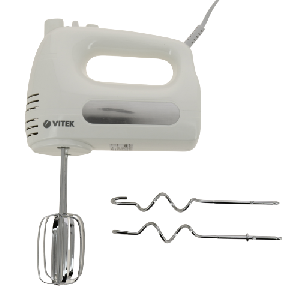 Миксер VITEK VT-1426 в классическом белом корпусе обладает мощностью 500 Вт. При наличии 6 рабочих скоростей это позволяет ему замешивать густое и жидкое тесто, готовить кремы для десертов и измельчать вареные овощи в пюре. Для выполнения всех этих задач прибор имеет 4 насадки – по 2 парных крюка и венчика. Снимать их можно одним нажатием кнопки. Также необходимо отметить наличие турборежима у устройства. Длина шнура питания модели составляет 1.2 м, а вес корпуса – 1 кг. Все эти характеристики указывают на удобство использования миксера VITEK VT-1426.