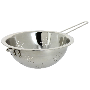 Дуршлаг МФК изготовлен из качественной нержавеющей стали и снабжен длинной ручкой. Изделие предназначено для процеживания макарон, мытья ягод, фруктов и овощей. Отверстие на ручке позволяет подвесить дуршлаг в любое удобное для вас место. Диаметр 22см.