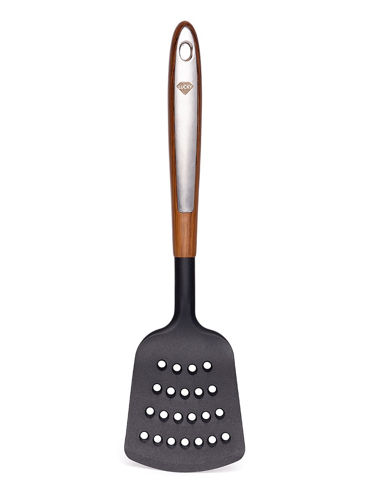 Лопатка кулинарная с дырочками 34x9см LUCKY ручка под дерево со стальной вставкой пластик