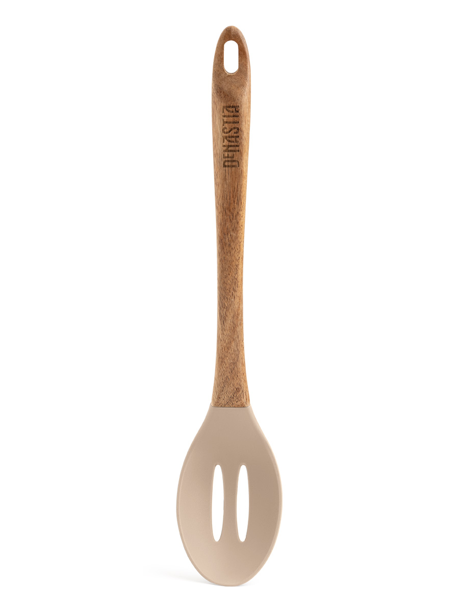 Ложка с прорезями 33x6,2x1,6см DE'NASTIA деревянная ручка бежевый силикон