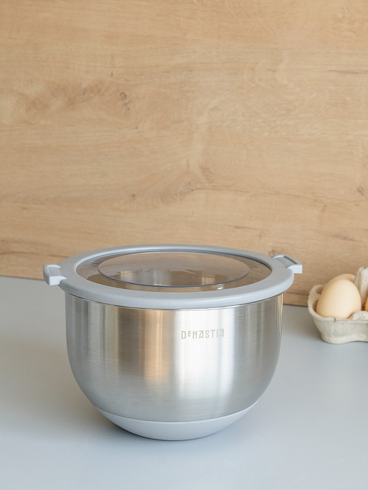 Миска 1,5л DE'NASTIA прозрачная крышка силиконовое дно серый нержавеющая сталь