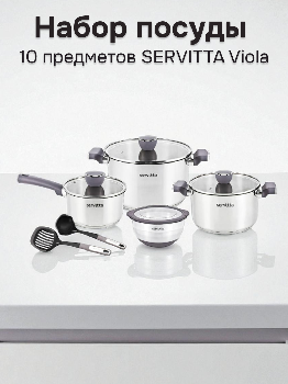 Набор посуды для приготовления 10 предметов SERVITTA Viola (кастрюли 5,8л/3,4л; ковш 1,8; миска 2,2л, навеска) ручки Soft Touch нержавеющая сталь