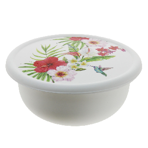 Миска с крышкой Тропики объёмом 2.1л выполнена из пищевого пластика. Стильная миска с тропическим принтом подойдет как для приготовления пищи, так и для ее хранения. Миска имеет крышку, которая плотно прилегает к корпусу и обеспечивает сохранность содержимого. Крышка декорирована с помощью технологии вплавляемой этикетки. Этикетка IML устойчива к стиранию. Высота миски – 9 см, диаметр – 22,5 см. Можно использовать в посудомоечной машине и СВЧ-печи (с открытой крышкой).