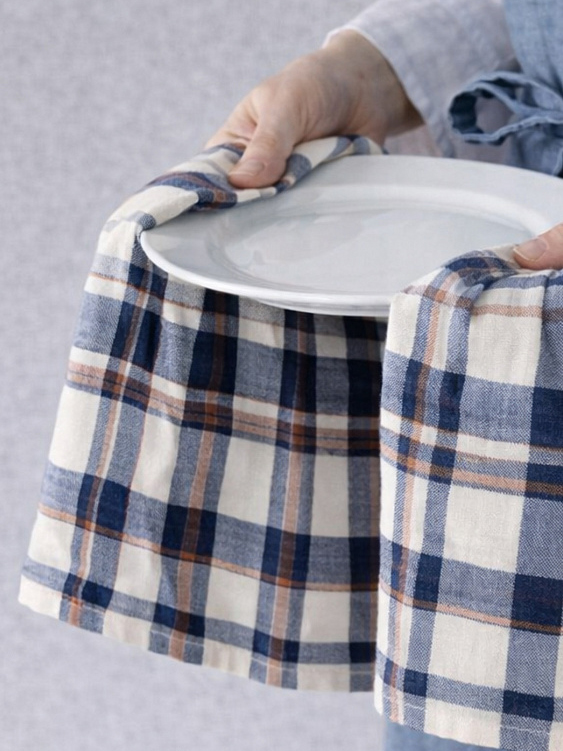 Полотенце кухонное 40x60см DE'NASTIA тартан 330гр белый/синий махра/лён хлопок