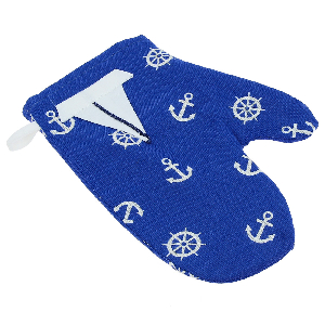Рукавица кухонная в морском стиле с изображением якорей и аппликации в виде корабля, из ткани бязь, ткань подклада -100 % хлопок способствует безопасному использованию на кухне. Рукавицу приятно будет подарить как самостоятельно, так и в комплекте состальным ассортиментом серии Семейная.