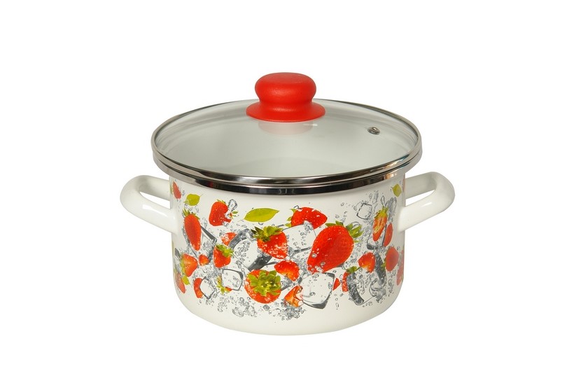 Кастрюля 2,5л OMELIA Клубника цилиндрическая форма стеклянная крышка эмаль