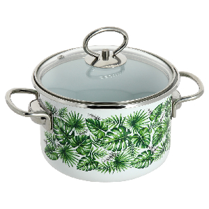 Кастрюля Тропик, объёмом 2л выполнена из высококачественной стали с эмалированным покрытием. Такое покрытие защищает сталь от коррозии, придает посуде гладкую стекловидную поверхность и надежно защищает от кислот и щелочей. Эмаль не вступает во взаимодействие с продуктами и не искажает их вкусовые качества. Прочный стальной корпус обеспечивает эффективную тепловую обработку пищевых продуктов и не деформируется в процессе эксплуатации. С внешней стороны кастрюля оформлена узорами тропических листьев. Жаропрочная стекляннаякрышка плотно прилегает к краям посуды, имеет отверстие для выхода пара, сохраняя аромат и вкус блюд. При этом можно наблюдать за готовностью пищи без потери тепла. Крышка оснащена удобной ручкой. Подходит для всех плит, включая индукционные. Можно мыть в посудомоечной машине. Диаметр – 18 см, высота стенки – 11 см.
