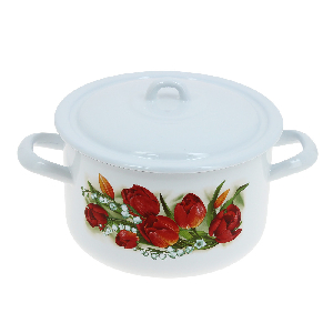 Кастрюля Ласковый май объёмом 2.9л изготовлена из нержавеющей стали с эмалированным покрытием. Уникальная рецептура стеклоэмалевогопокрытия разработана в собственной лаборатории завода. Такое покрытие защищает сталь от коррозии, придает посуде гладкую стекловидную поверхность и надежно защищает от кислот и щелочей. Посуда снабжена удобными ручками и крышкой. Внешние стенки дополнены красочным цветочным рисунком. Подходит для всех типов плит, включая индукционные.