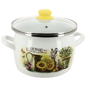 Кастрюля 5л сферической формы со стекленной крышкой, полыми ручками, белая внутри, белая снаружи с деколью Милый дом стальная эмалированная