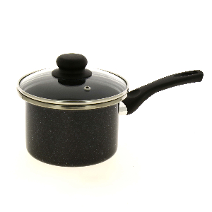 Ковш 1,5л с пластиковой ручкой, цилиндрической формы со стеклянной крышкой, серый гранит внутри, серый гранит снаружи стальной эмалированный