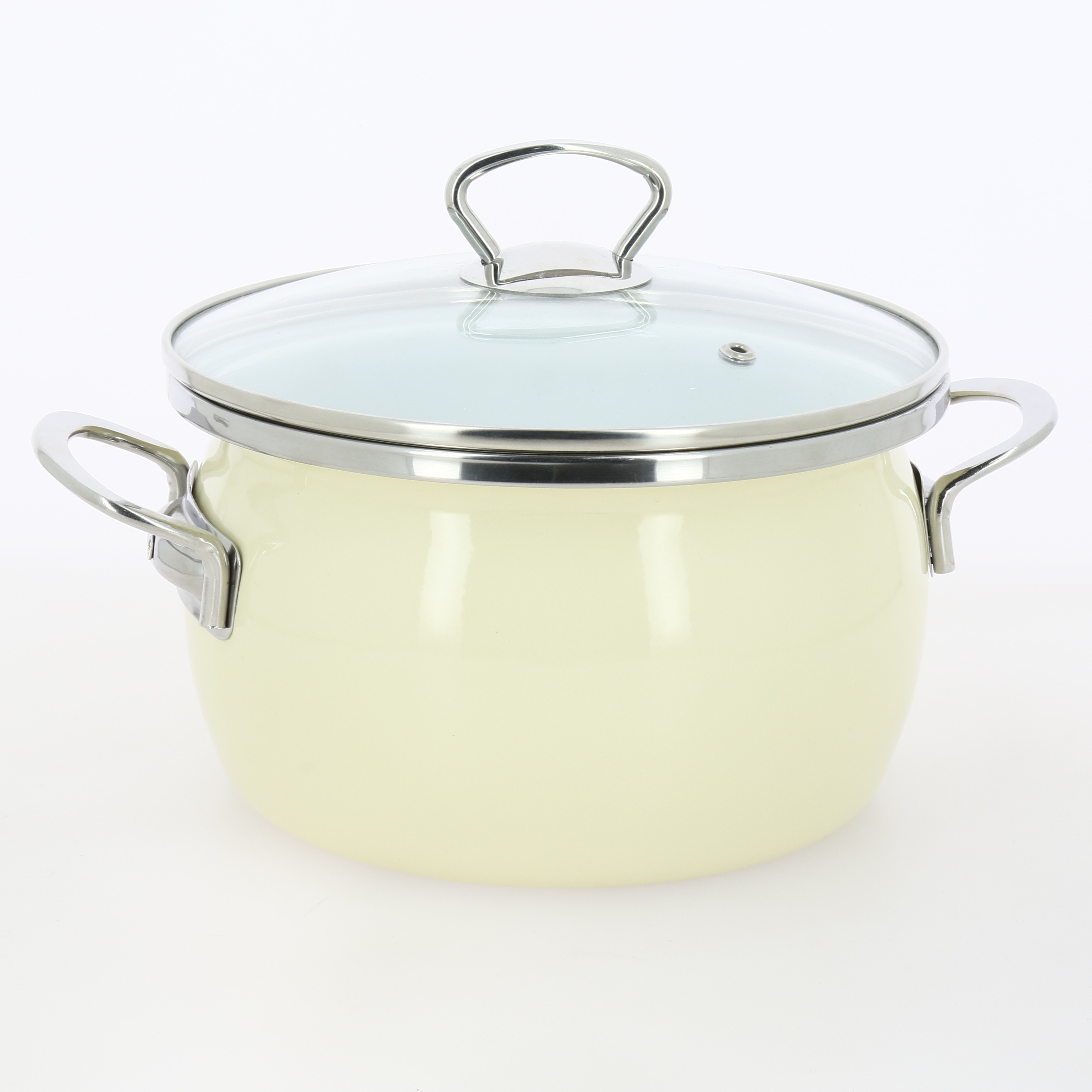 Кастрюля 3л сферической формы со стеклянной крышкой, нержавеющими ручками, белая внутри, бежевая снаружи стальная эмалированная