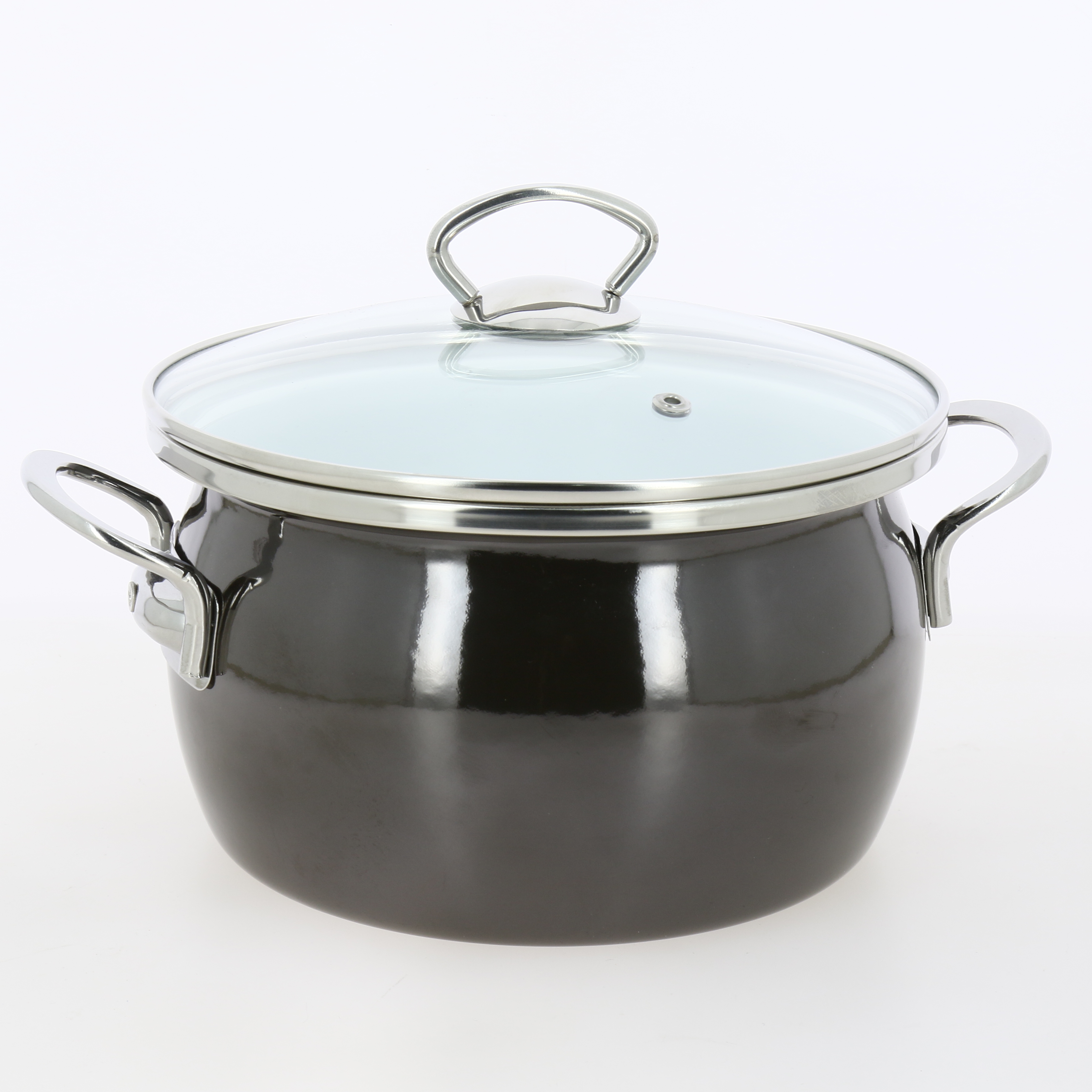 Кастрюля 3л сферической формы со стеклянной крышкой нержавеющими ручками, белая внутри, темно-серый хром снаружи стальная эмалированная