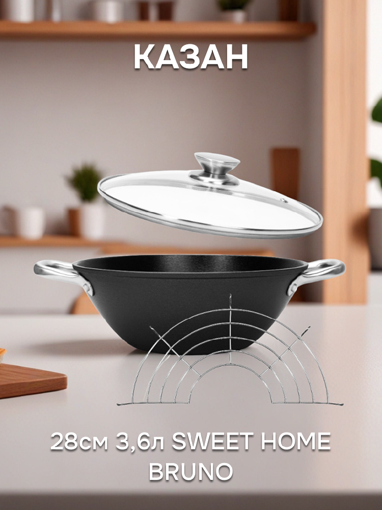 Казан 28см 3,6л SWEET HOME BRUNO/Оазис тонкостенный с крышкой решетка цвет черный чугун