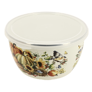 Миска Тыква порадует как сторонников практичности, так и ценителей выразительного дизайна. Изделие изготовлено из прочной стали с трехслойным покрытием из стеклоэмали – инертного и устойчивого к пищевым кислотам материала. В емкости можно хранить подготовленные к заправке салаты, разогревать супы, замариновать курицу или мясо. Посуда совместима со всеми типами плит, хорошо переносит мытье в ПММ. Снаружи стенки украшены яркими рисунками.