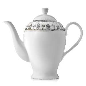 Заварочный чайник 1290 мл из твердого фарфора. Форма изделия конусообразная. Рисунок Домики. Цвет белый. Разрешено использовать в посудомоечной машине и в микроволновой печи. Гарантия 1,5 года.