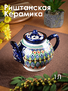 Чайник заварочный 1л RISHTON KULOLCHILIC рисунок мехроб синий Риштанская керамика UZ009/UZ022