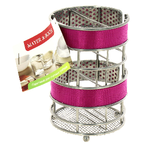 Подставка для столовых приборов представляет собой каркас из хромированной проволоки на трех круглых ножках. Круглое устойчивое основание подставки выполнено из стальной сетки, бортики украшены красивым цветочным узором. Разделенная на две равные секции, подставка позволяет аккуратно хранить основные типы столовых приборов. Вы можете установить ее в любом удобном месте на вашей кухне, за счет хромированного покрытия изделие не будет ржаветь в условиях повышенной влажности. Такая подставка для столовых приборов станет полезным аксессуаром в домашнем быту и идеально впишется в интерьер современной кухни.