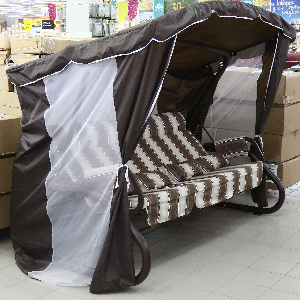 Комплектация: диван: спинка + сидение с оборкой - цельный диван (один элемент), подголовник на диван; два подлокотника, четыре декоративные подушки 40*30 см, два пластиковых подстаканника, антимоскиткная сетка с зановеской из ткани тента