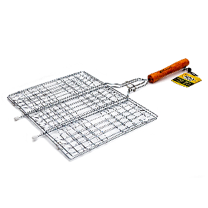Универсальная решетка-гриль BBQ time изготовлена из высококачественной стали. На решетке удобно размещать стейки, ребрышки, гамбургеры, сосиски, рыбу, овощи. Решетка предназначена для приготовления пищи на углях. Блюда получаются сочными, ароматными, с аппетитной специфической корочкой. Рукоятка изделия оснащена деревянной вставкой и фиксирующей скобой, которая зажимает створки решетки.