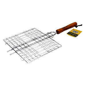 Универсальная решетка-гриль BBQ time изготовлена из высококачественной стали. На решетке удобно размещать стейки, ребрышки, гамбургеры, сосиски, рыбу, овощи. Решетка предназначена для приготовления пищи на углях. Блюда получаются сочными, ароматными, с аппетитной специфической корочкой. Рукоятка изделия оснащена деревянной вставкой и фиксирующей скобой, которая зажимает створки решетки.