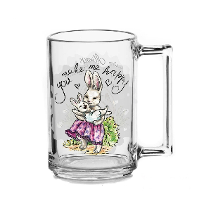Кружка «Кроль-Вилль. Любовь в сердце» изготовлена из прозрачного стекла и украшена рисунками кроликов в пастельных тонах.