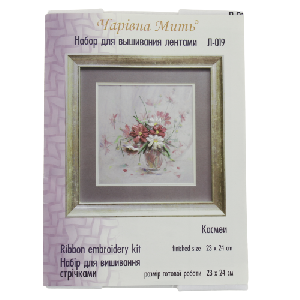 В набор входит: цветная схема, ткань для вышивания с нанесенным рисунком, мулине Anchor (1 цвет), ленты (Испания)(6 цветов), бисер (Чехия) (2 цвета)и игла.