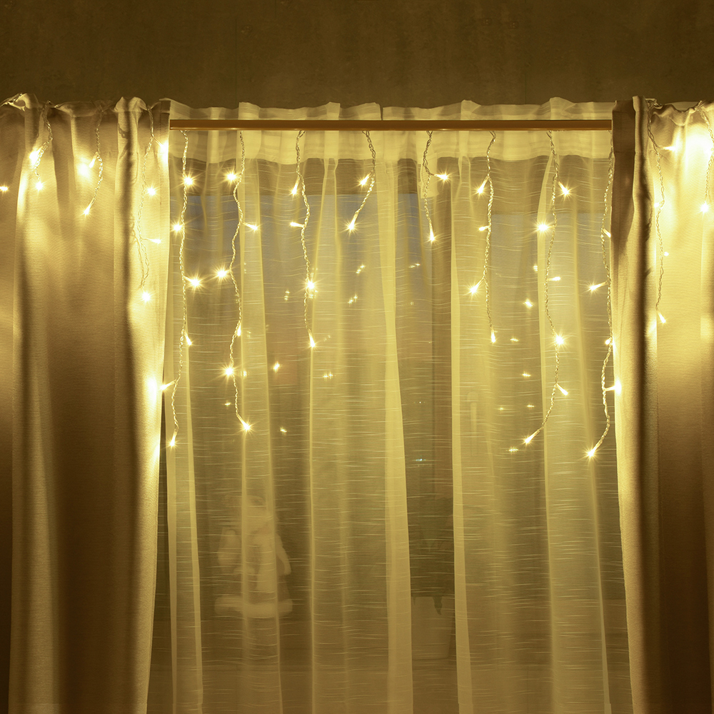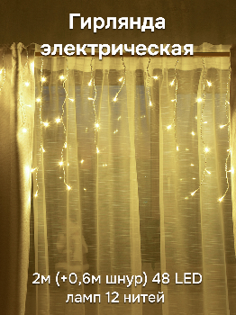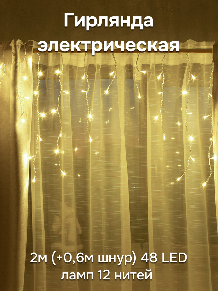 Гирлянда электрическая 2м(+0,6м шнур) 48 LED ламп 12 нитей VEGAS Бахрома теплый свет 8 режимов прозрачный провод 220v