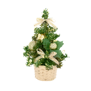 Ель искусственная на подставке с украшениями — миниатюрный декор для новогоднего интерьера. Подойдет для украшения полок, стола, подоконника. Дерево изготовлено из ПВХ.