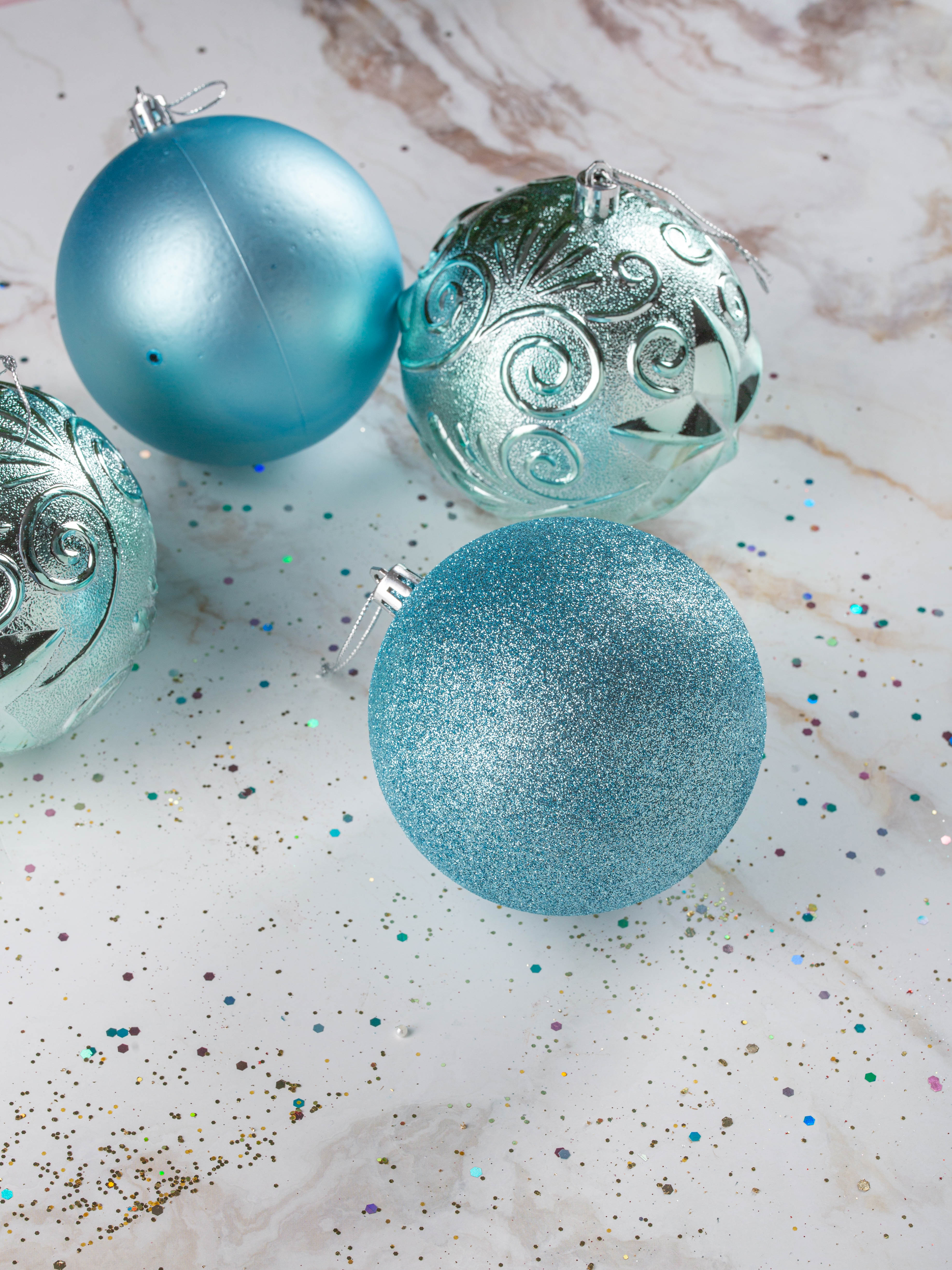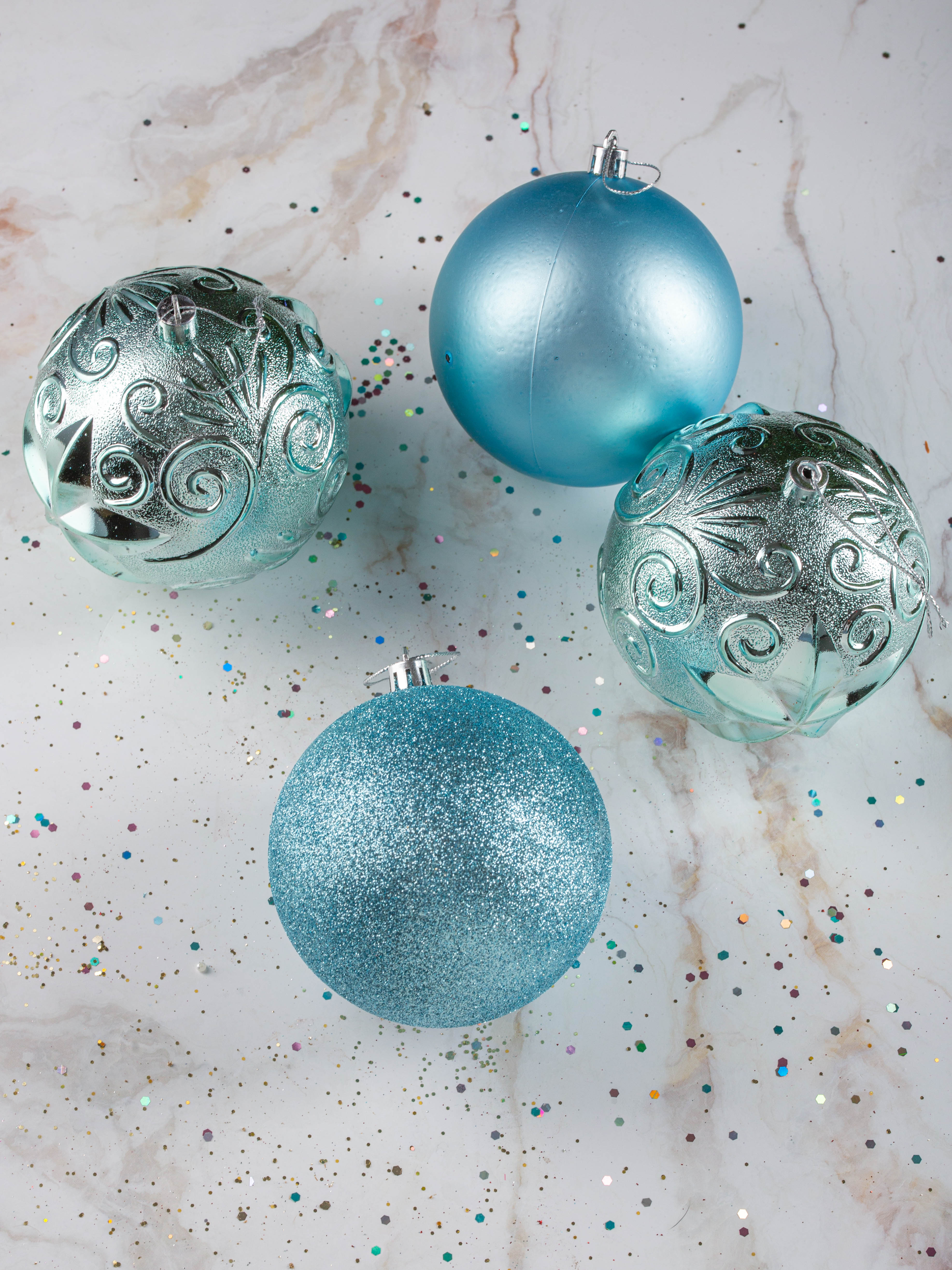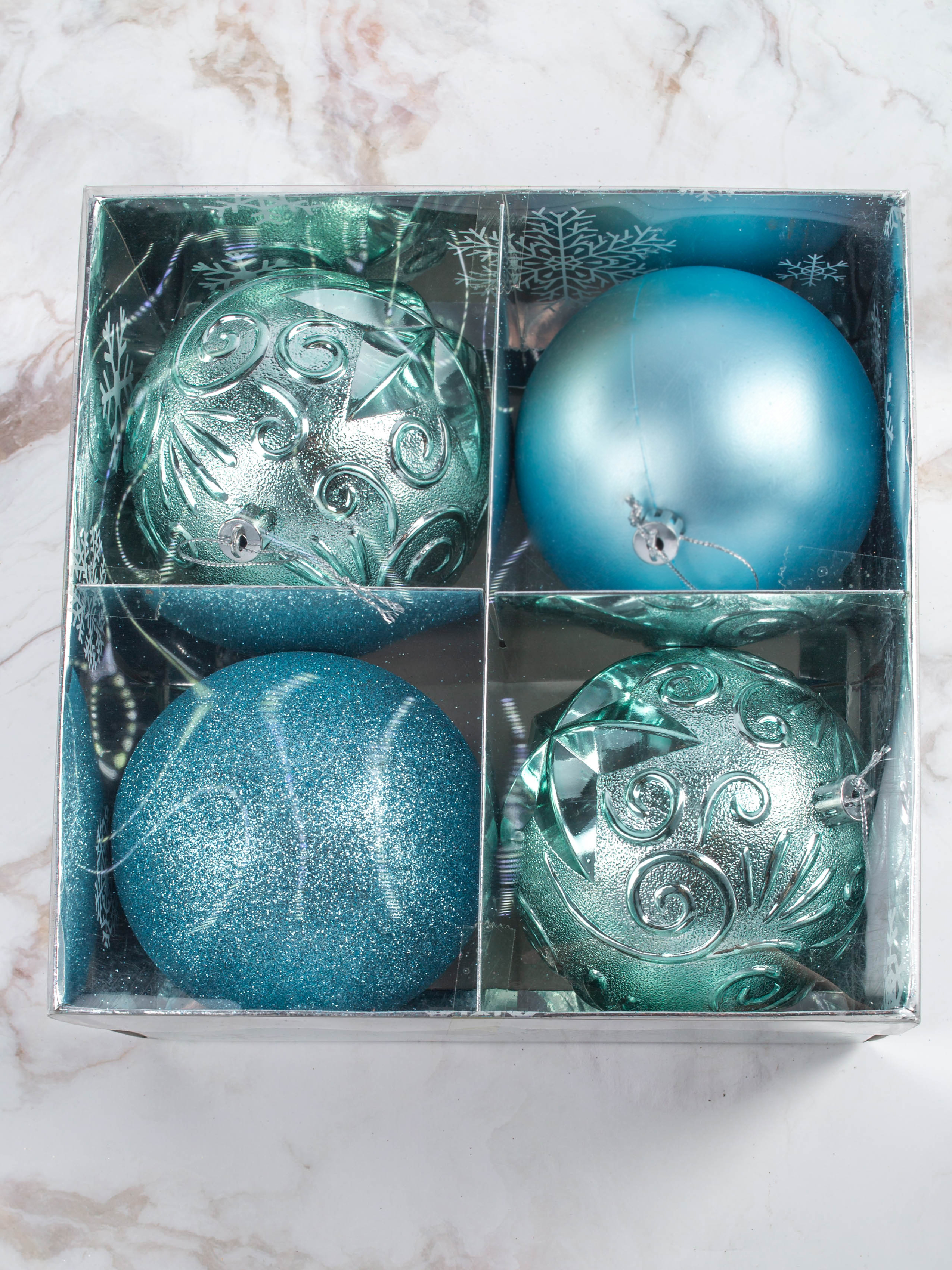 Набор украшений декоративных 4шт голубой (шар матовый 10см-1шт, шар с блестками 10см-1шт, шар с рисунком 10см-2шт)