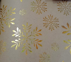 Крафт бумага Золотые снежинки в листах размером 100х70см, немелованная, с декоративным рисунком, плотность 60 г/м2, свернута в рулон