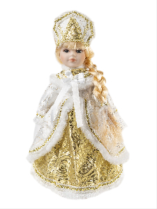 Декоративная кукла Magic Time Снегурочка Асенька выполнена из высококачественной керамики. Туловище куклы мягкое набивное. Трогательные глаза обрамлены пышными ресницами, а светлые волосы заплетены в косу. Кукла максимально приближена к живому прототипу – юной леди с румянцем на щеках. Снегурочка наряжена в роскошную шубку, декорированную тесьмой и блестками, а голова украшена кокошником. Кукла устанавливается на пластиковую подставку, благодаря которой вы можете поместить ее в любом понравившемся месте. Такая кукла займет достойное место в вашей коллекции или станет чудесным подарком на Новый год.