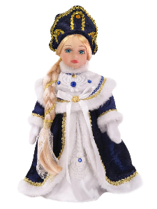 Декоративная кукла Magic Time Снегурочка выполнена из высококачественной керамики. Туловище куклы мягкое набивное. Трогательные глаза обрамлены пышными ресницами, а светлые волосы заплетены в косу. Кукла максимально приближена к живому прототипу – юной леди с румянцем на щеках. Снегурочка наряжена в роскошную шубку, декорированную тесьмой и блестками, а голова украшена кокошником. Кукла устанавливается на пластиковую подставку, благодаря которой вы можете поместить ее в любом понравившемся месте. Такая кукла займет достойное место в вашей коллекции или станет чудесным подарком на Новый год.