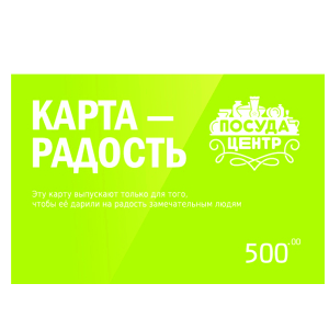 Подарочная карта Радость – это универсальный подарок, который придется по вкусу каждому. Картой можно поздравить друзей или знакомых с любым праздником или торжественной датой, или просто использовать ее как повод сделать приятно близкому человеку. Покупая карту в подарок, можно забыть о муках выбора и не гадать, понравится ли дар получателю. По подарочной карте каждый может выбрать себе то, что ему нужно и о чем давно мечталось. Картой можно оплатить любой товар из ассортимента «Посуда Центр». Номинал карты – 500 рублей,сумму на карте можно использовать сразу полностью или постепенно по частям. Подарочная карта активируется на следующий день после продажи (без активации не действительна) и действует в течение 12 месяцев после этой даты.