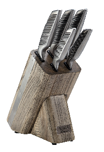 Нож поварской (лезвие 20 см х 2,5 мм), Нож для нарезки (лезвие 20,5 см х 2,5 мм), Нож для хлеба (лезвие 20,5 см х 2,5 мм) , Нож универсальный (лезвие 12 см х 1,8 мм), Нож для чистки (лезвие 8 см х 1,8 мм), Подставка из дерева ясеня