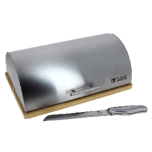 Хлебница Taller предназначена для хранения хлебобулочных изделий, надолго сохраняя их свежесть. Основание, выполненное из прочного каучукового дерева, позволяет нарезать на нем хлеб, не используя разделочную доску. Крышка из качественной нержавеющей стали с матовой полировкой устойчива к царапинам. Благодаря специальной конструкции боковых креплений и силиконовым стопперам крышка хлебницы закрывается бесшумно и плавно. В комплект входит специальный нож для хлеба, изготовленный из нержавеющей стали, который надежно фиксируется в прорези в основании хлебницы.