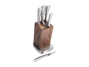 Ножи выполнены из высококачественнойстали 420S45. Режущая кромка лезвия ножа устойчива к притуплению. Рукоятки ножей выполнены из коррозионностойкой стали. Ножи отлично сбалансированы и удобно ложатся в руку. Подставка выполнена из орехового дерева и металла.