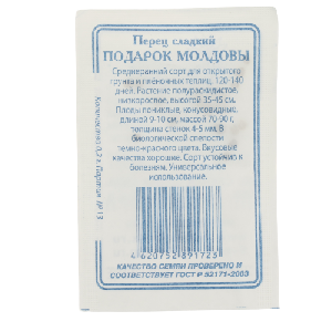 Данный сорт культуры пришел к нам из Молдовы, о чем и свидетельствует название. Перец скороспелый. Плоды имеют форму конуса, пониклые, длиной 9-10 см. В состоянии технической зрелости имеют светло-зеленый окрас, а при наступлении технической – окрашиваются в темно-красный цвет. Каждый плод весит 50-80 г. Перец Подарок Молдовы очень вкусный, поэтому используется как в свежем виде для приготовления салатов, так и добавляется в борщи, супы, рагу и другие блюда. Также его консервируют и маринуют на зиму, потому что период его хранения составляет 30 дней. Данную культуру следует употреблять в свежем виде как можно больше, потому что он является профилактическим средством при анемии, повышает иммунитет, улучшает пищеварение, успокаивает нервы.