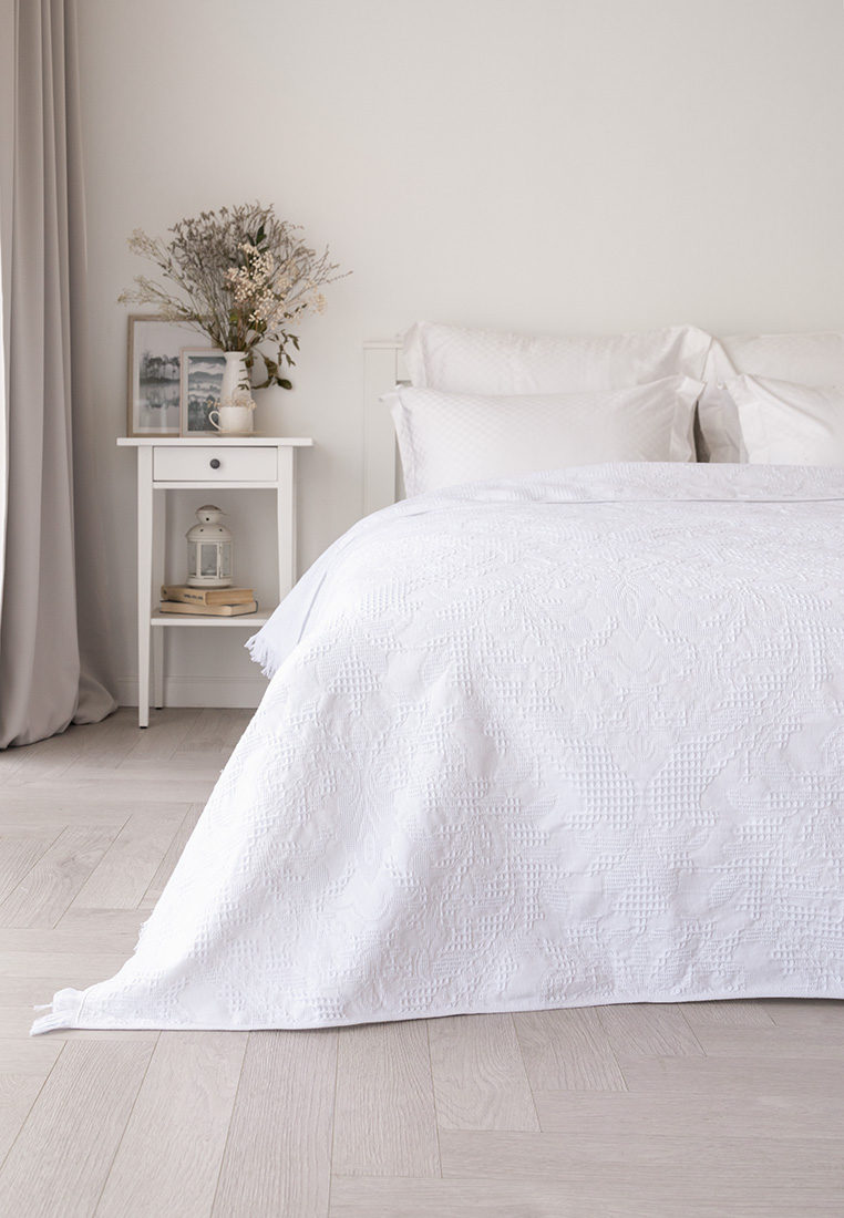 Покрывало 150x200см LUCKY Листья с бахромой белое 100% хлопок