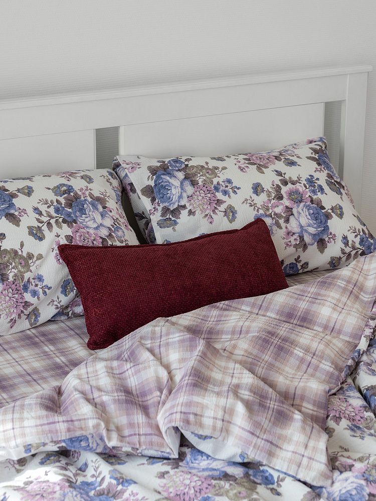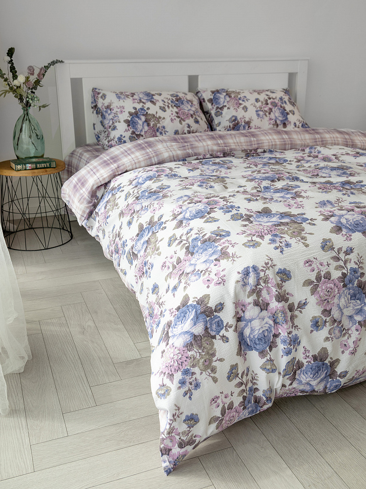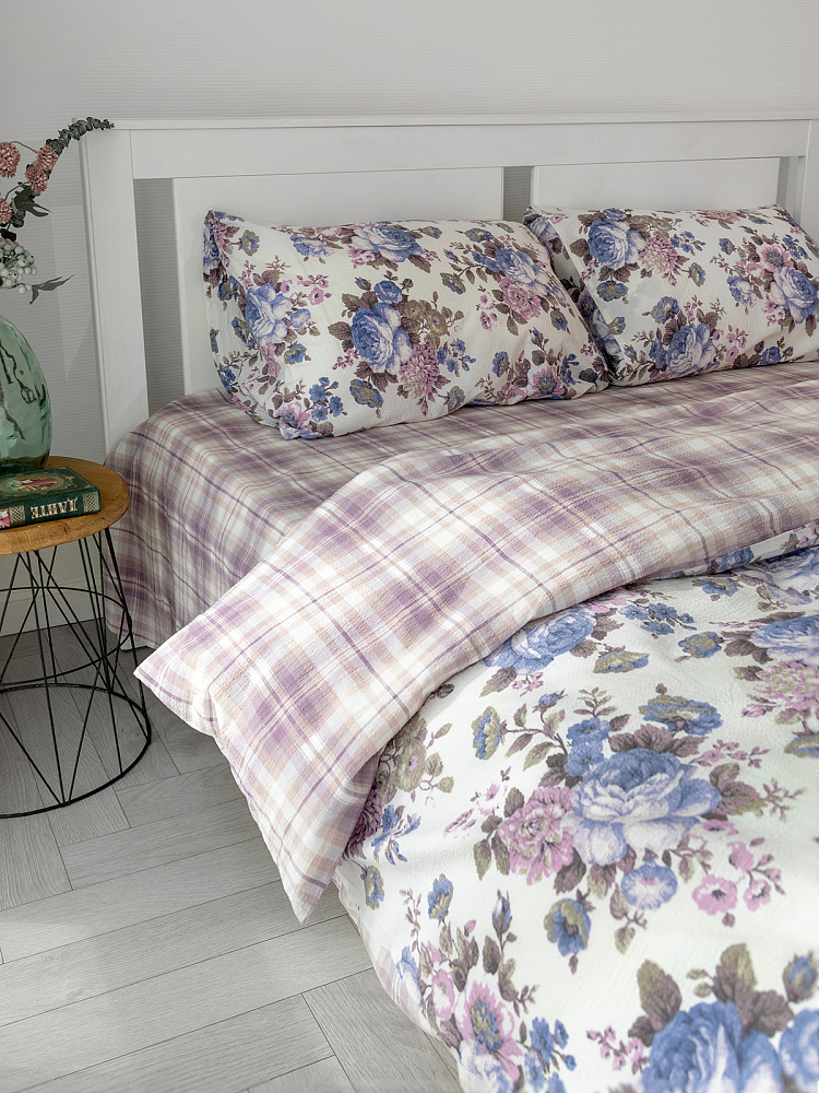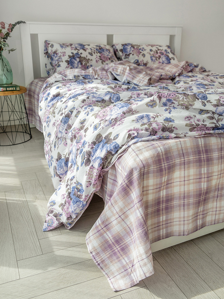 Комплект постельного белья2спDE'NASTIA (пододеяльник175х210см простыня215х240см наволочки50x70см-2шт) Dream Пионы/Клетка фиолетовый/белый жатый хлопок