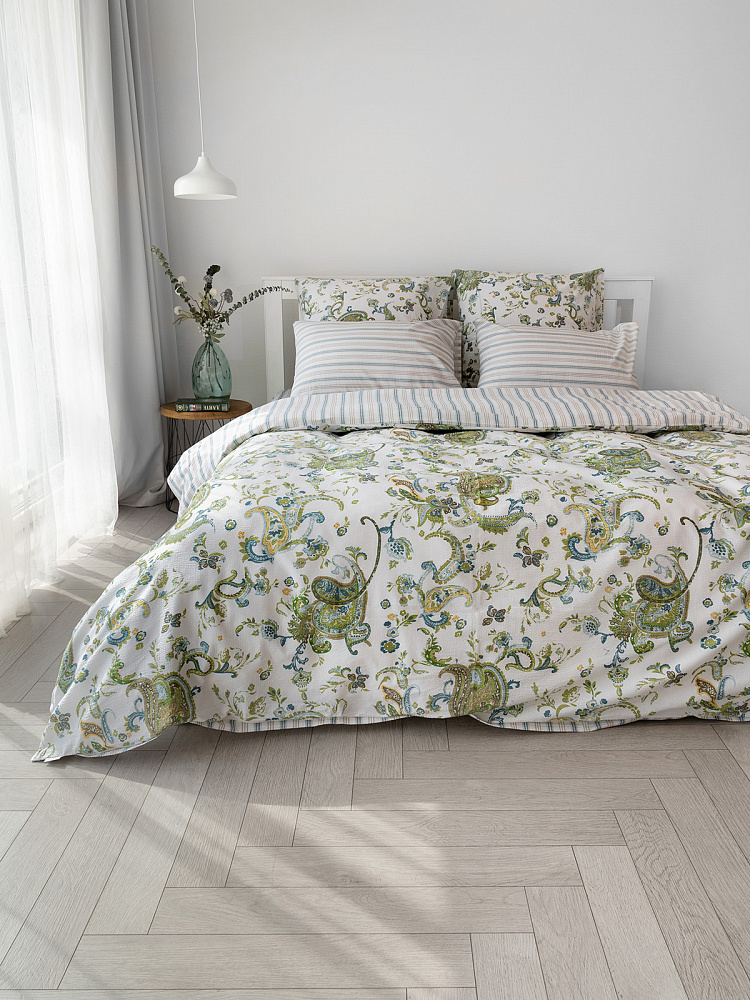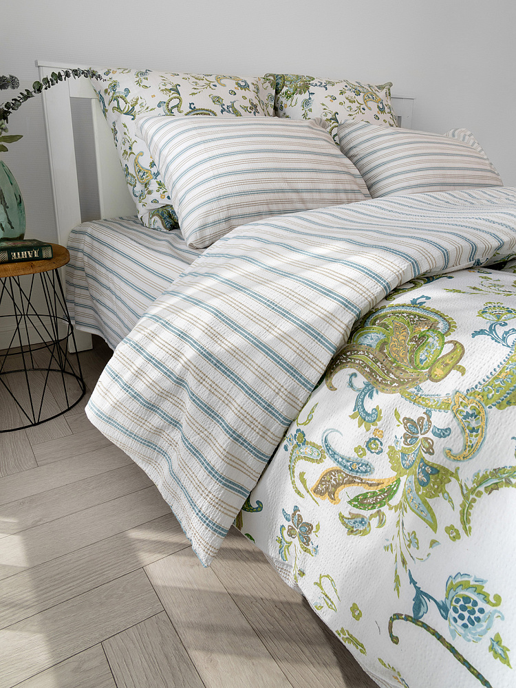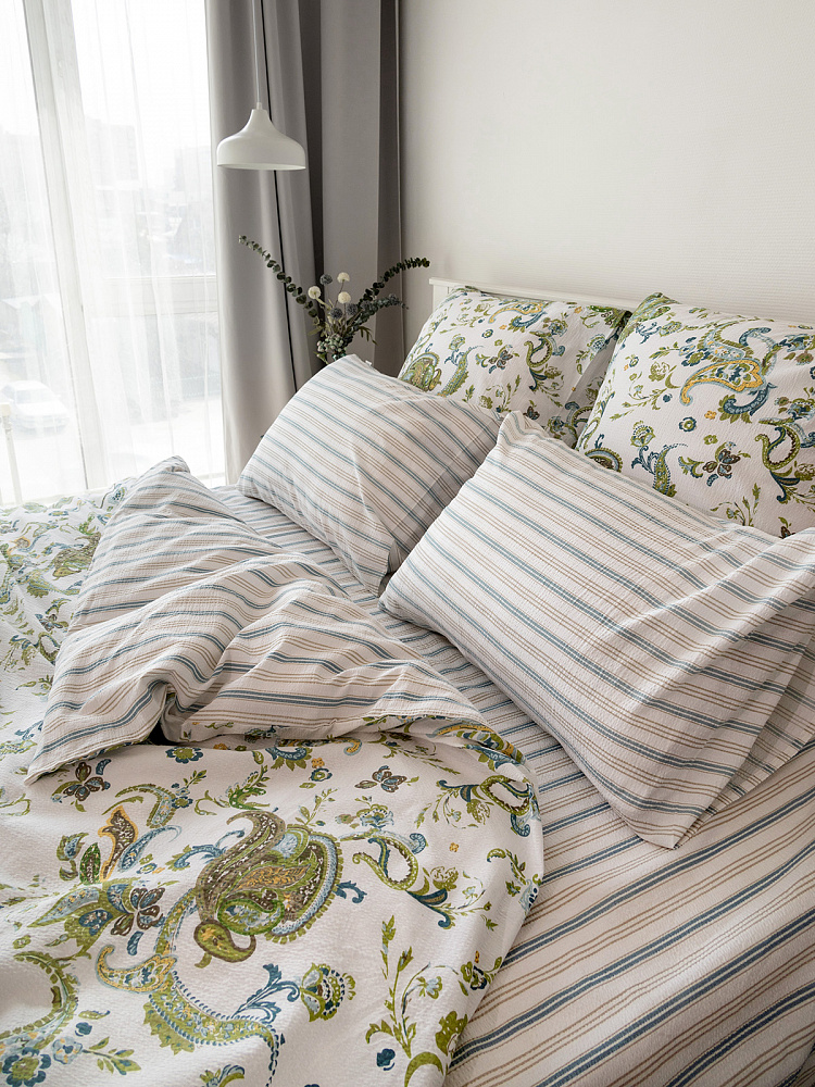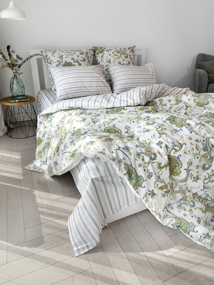 Комплект постельного бельяЕвроDE'NASTIA(пододеяльник200х220простыня230х260наволочки50x70см2шт70х70см2шт)BotehОгурцыПолоскаБелыйЗеленыйСинийЖатыйХлопок